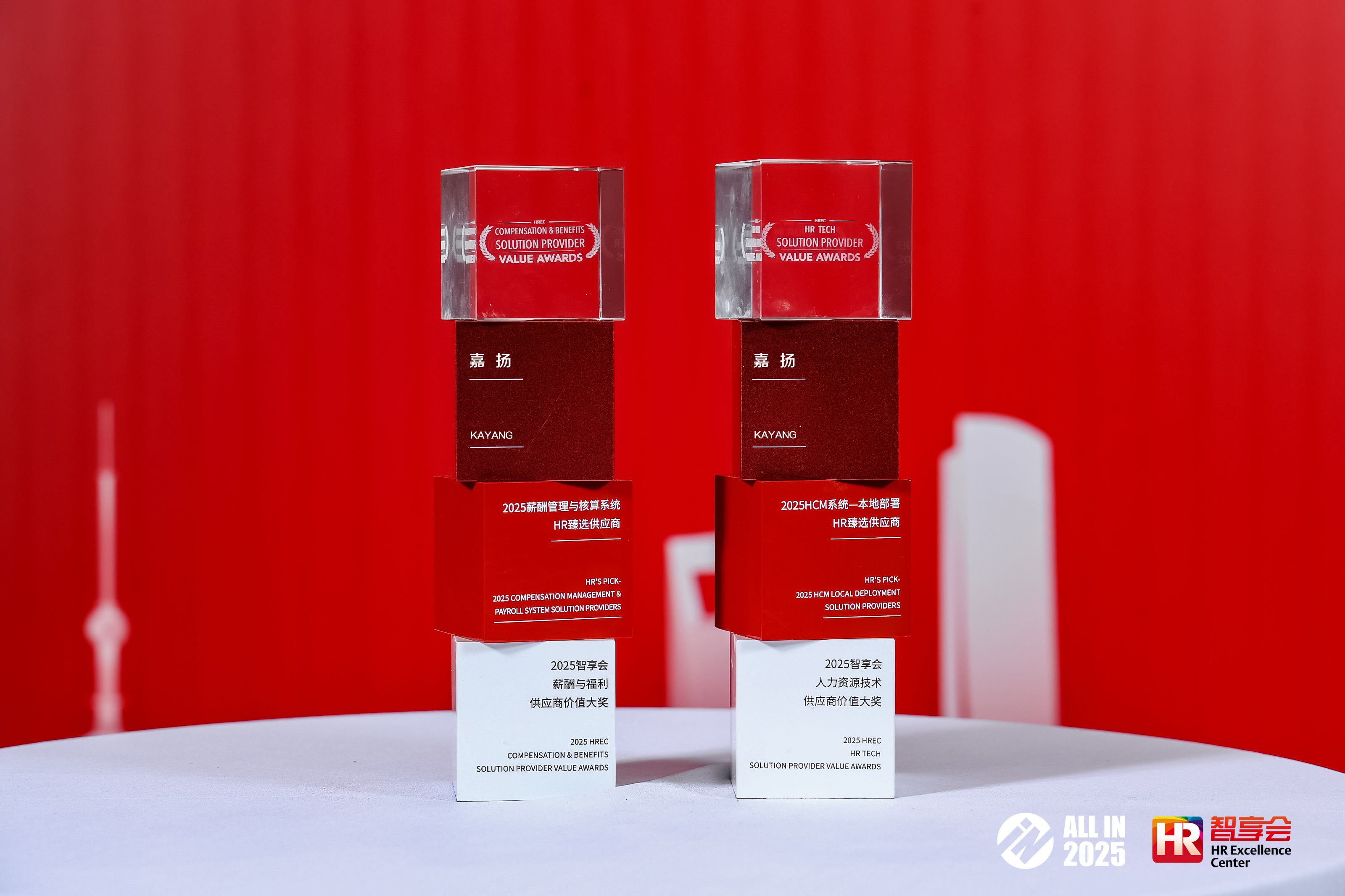 9月16-17日,“ALL IN 2025人力资源服务展 - 上海站”圆满举办,同期“2025智享会人力资源技术供应商价值大奖”颁奖典礼盛大启幕。上海嘉扬信息系统有限公司凭借卓越的专业服务能力、良好的品牌口碑以及广泛的市场影响力,成功斩获两项“2025智享会人力资源技术供应商价值大奖”【2025薪酬管理与核算系统HR臻选供应商&2025HCM系统——本地部署HR臻选供应商】。本次获奖,既是对公司过往成绩的高度肯定,也再次彰显了嘉扬在人力资源技术服务领域的显著优势和领先地位。